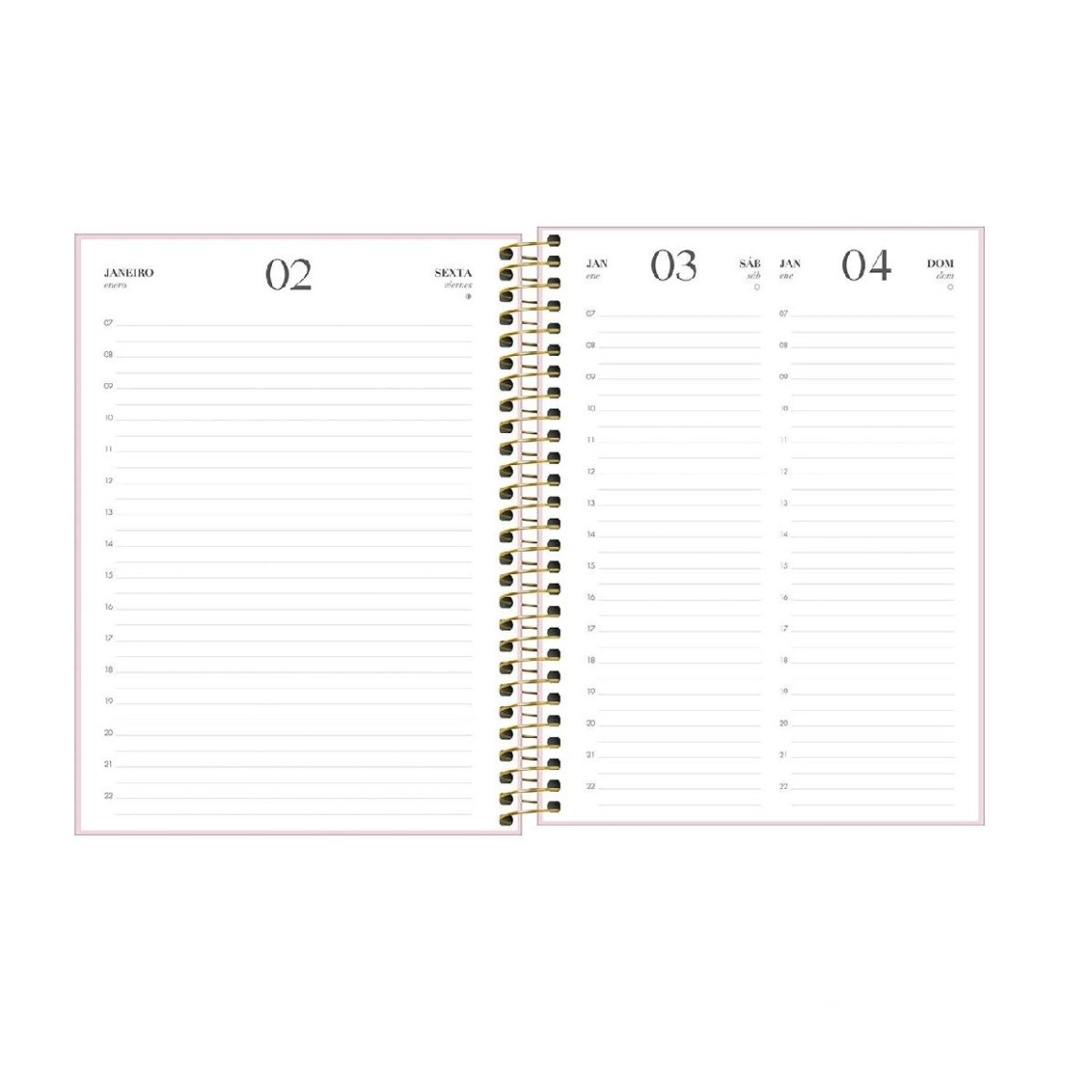 O produto tem tamanho 17,7 x 24 cm, capa dura revestida com material especial para oferecer visual sofisticado, bolsa plástica, folhas com visão de um dia por página, exceto aos sábados e domingos, e pautas com horário entre 7h e 22h.