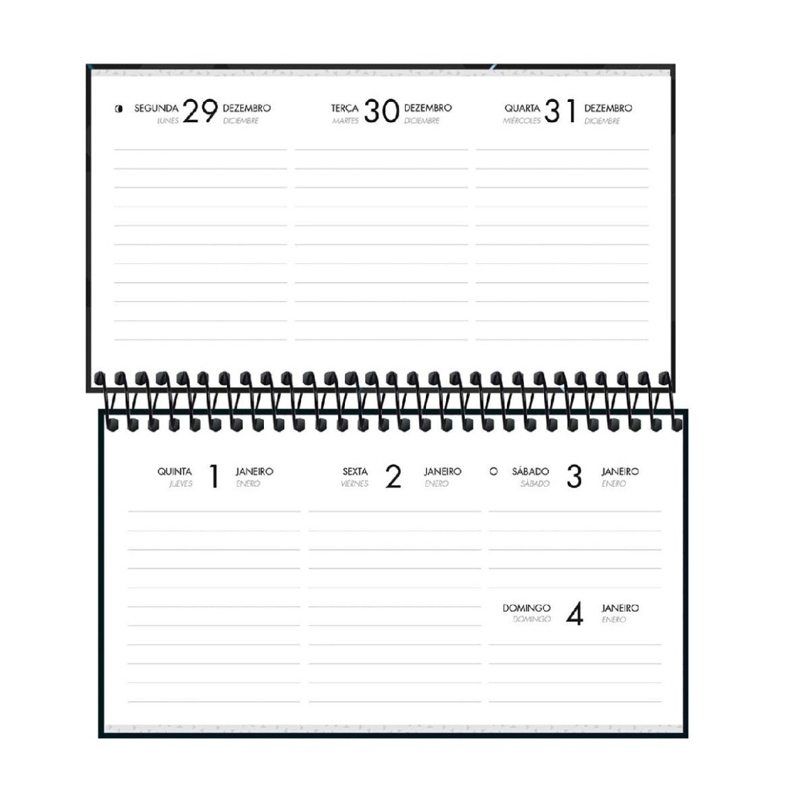 Agenda espiralada com visão semanal. Possui visual neutro e atual, com capa dura e formato compacto, ideal para guardar na bolsa e auxiliar na organização do dia a dia.