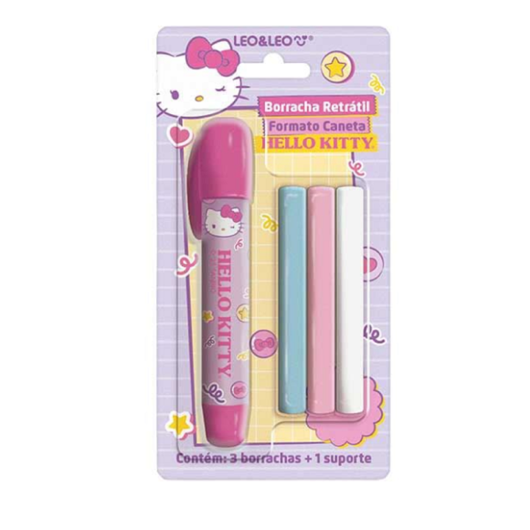 Prática, bonita e funcional, a Borracha Caneta Retrátil Hello Kitty Blister com 1 Suporte e 3 Borrachas Leo&Leo é ótima para apagar o que foi escrito ou rabiscado e precisa ser corrigido.