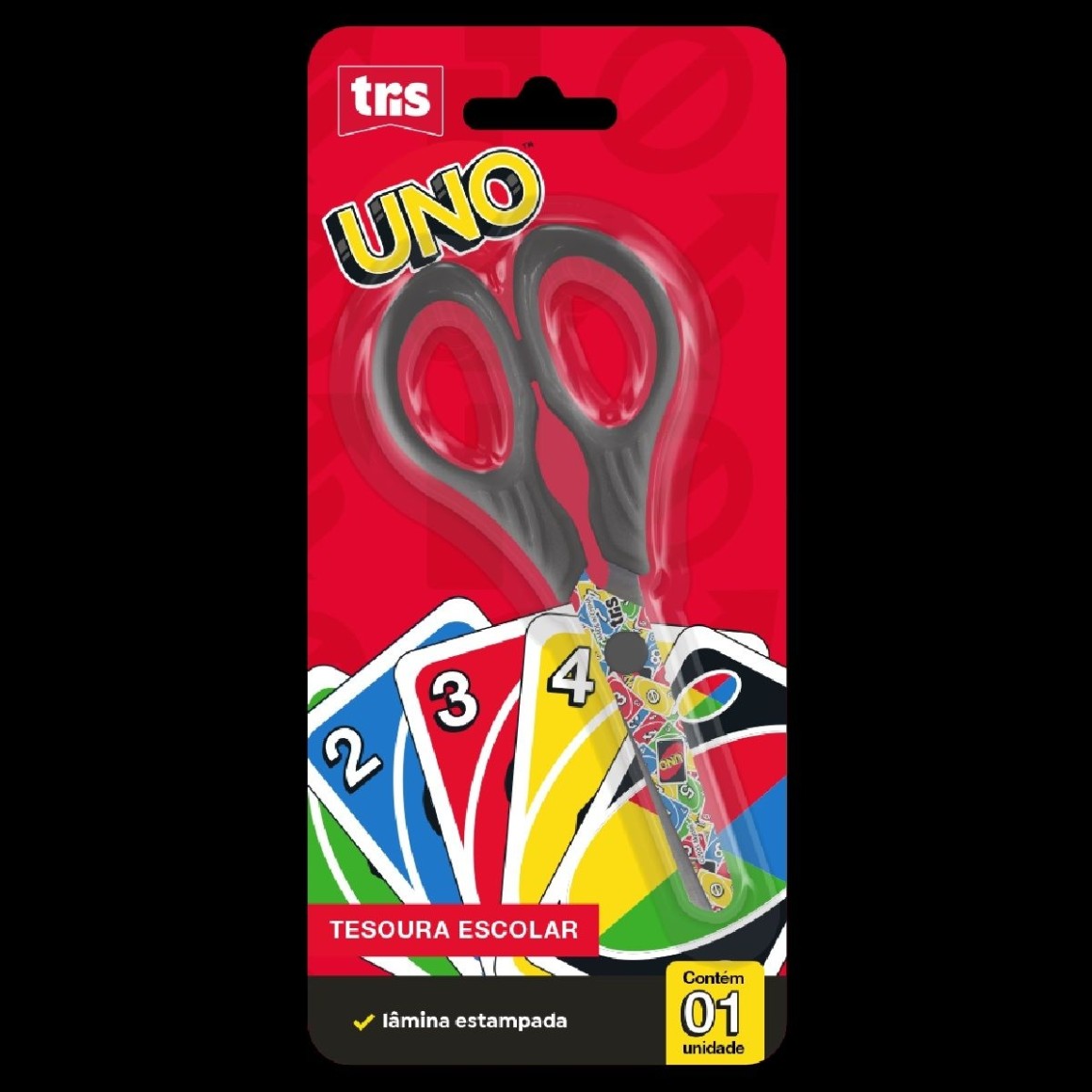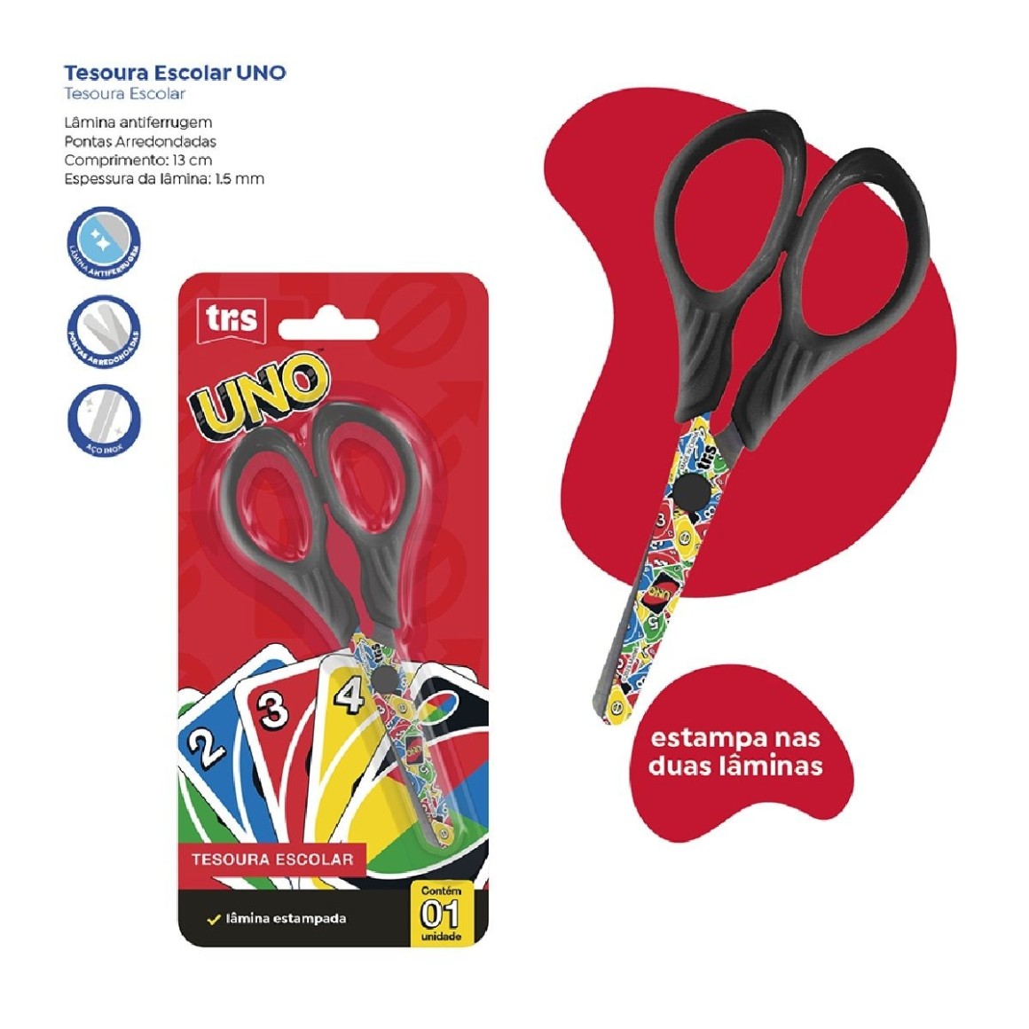 Com pontas arredondadas e cabo resistente em PP, a tesoura Uno possui as lâminas decoradas, 13cm de comprimento total e 1,5mm de espessura de lâmina.