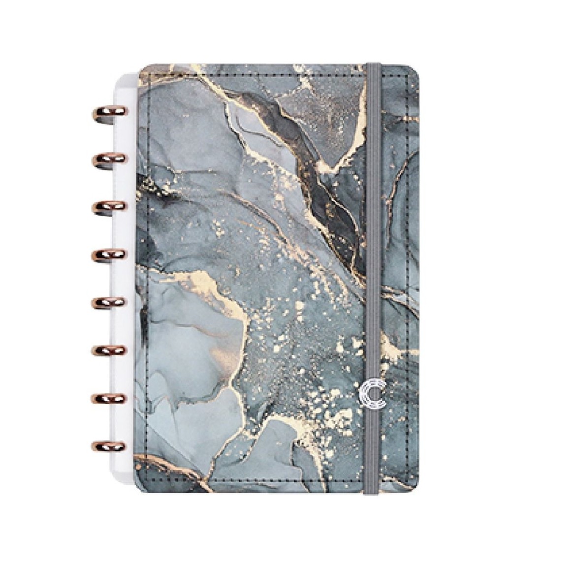 Ônyx é um caderno sofisticado e elegante, na cor cinza chumbo com detalhes em tons constratantes, que remetem aos veios de uma nobre pedra de mármore, que oferecem um efeito visual cheio de beleza para o seu novo BFF.