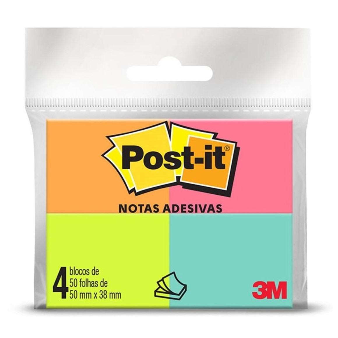 Tradicional bloco de notas adesivas Post-it, embalagem com 4 blocos coloridos (laranja, rosa, verde e azul), cada bloco possui 50 folhas de 50X38mm. Ideal para pequenas anotações e lembretes.