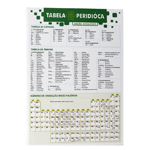 Para auxiliar o leitor em seus estudos e pesquisas, esta publicação traz uma versão atualizada, colorida e ilustrada da Tabela de Classificação Periódica dos Elementos e um resumo de alguns princípios fundamentais da Química. De um lado, em página dupla, são apresentados os elementos químicos na Tabela de Classificação Periódica dos Elementos e, no verso, quadros com informações sobre os seguintes assuntos: Classificação dos elementos químicos; Elementos representativos e elementos de transição interna e externa; tabela de solubilidade; Tabela de cátions; Tabela de ânions; Diagrama de Linus Pauling.