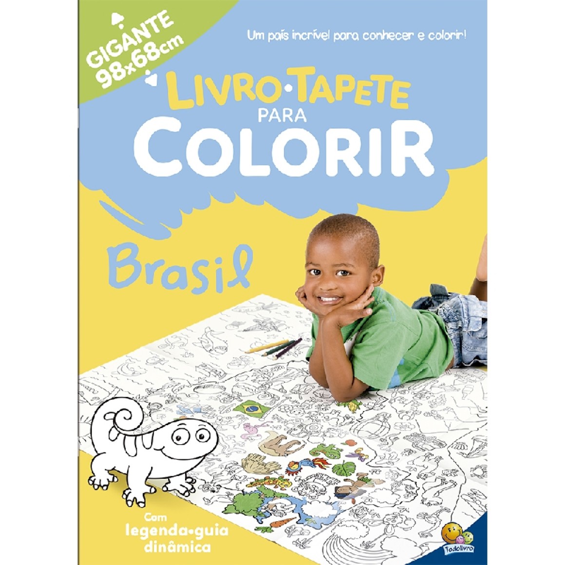 Um Livro-Tapete GIGANTE que contém um mapa superdivertido com uma infinidade de desenhos para a criança colorir, conhecer melhor o BRASIL (lugares, pontos turísticos, eventos culturais, os animais e a natureza exuberante, como a mata amazônica) e, literalmente, se "debruçar" e soltar a imaginação, exercitando habilidades essenciais para o desenvolvimento cognitivo, psicomotor e a linguagem, por meio da associação de "figuras" e o reconhecimento de palavras.