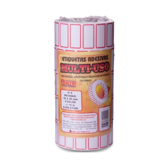 ETIQUETAS ADESIVAS N6 39X20MM 5 ROLOS C/10M 2500 ETIQUETAS FITACREL